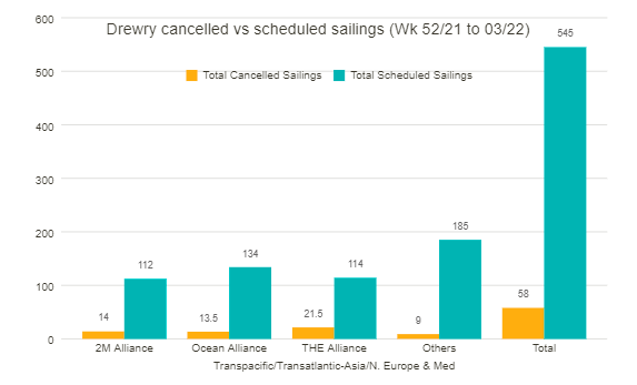 在跨太平洋、跨大西洋、亚洲-北欧和亚洲-地中海等主要航线总共545个预定航次中,在第52周至明年第3周之间取消了58个航次,取消率为11%。根据德鲁里本期数据,在此期间,66%的空白航行将发生在跨太平洋东向贸易航线中,主要是前往美国西海岸。