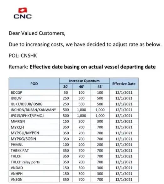 一柜难求已经开始出现在一些东南亚港口,而来自船公司的最新涨价通知显示,东南亚运费暴涨,不是空穴来风!以下是达飞旗下专注亚洲市场的CNC本周刚刚发布的涨价通知,涨幅不小!