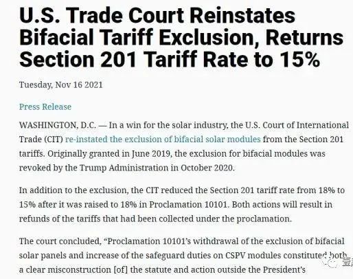 11月16日,美国国际贸易法院(CIT)正式宣布恢复双面组件201关税豁免权,并下调201关税税率。这意味着双面太阳能组件可以进口到美国,且不再征收额外的关税。
