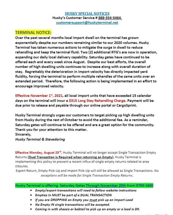 Effective November 1", 2021,all local import units that have exceeded 15 calendar days on the terminal will incur a $315 Long Stay Rehandling Charge. Payment will be due prior to release and payable through our online portal or CargoSprint.