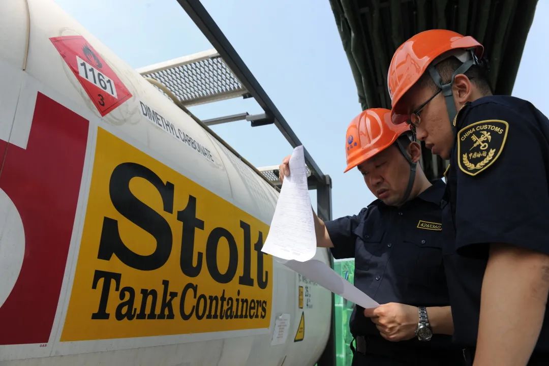 青岛海关关员现场查获违规出口危险化学品并核实相关信息。